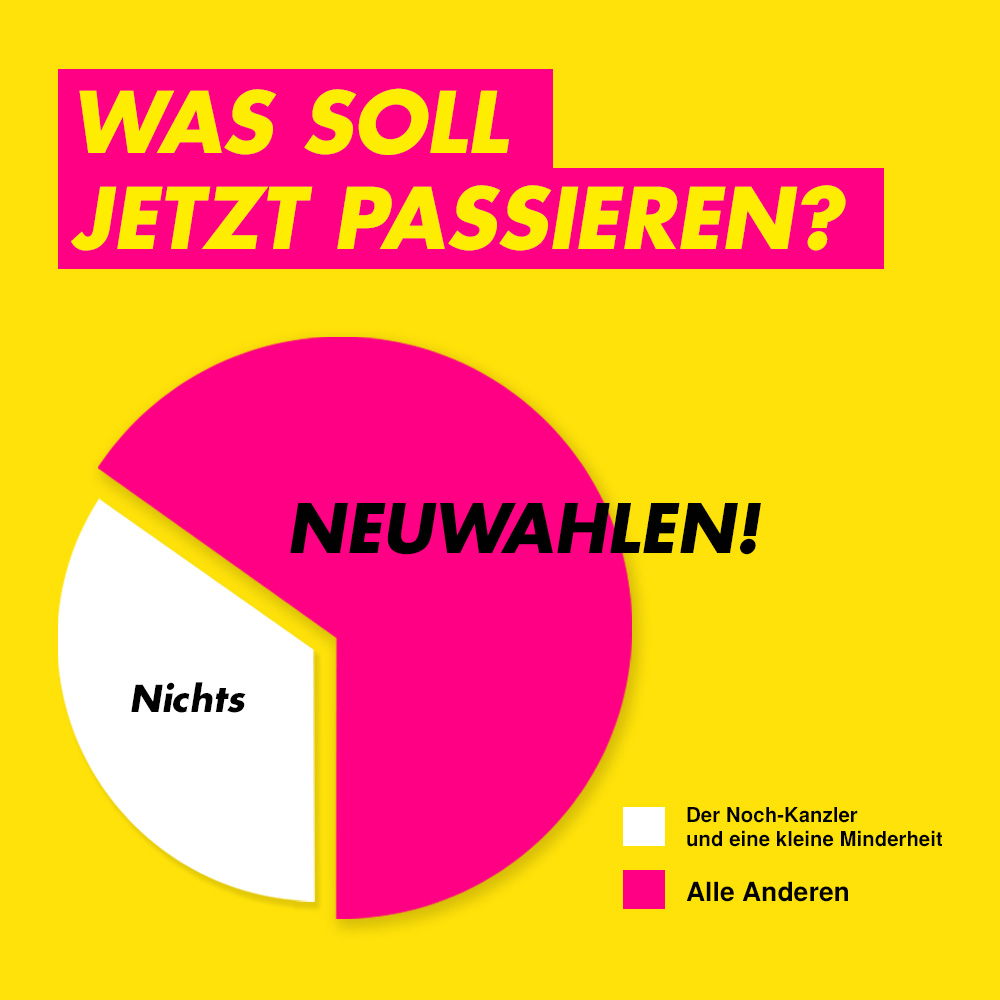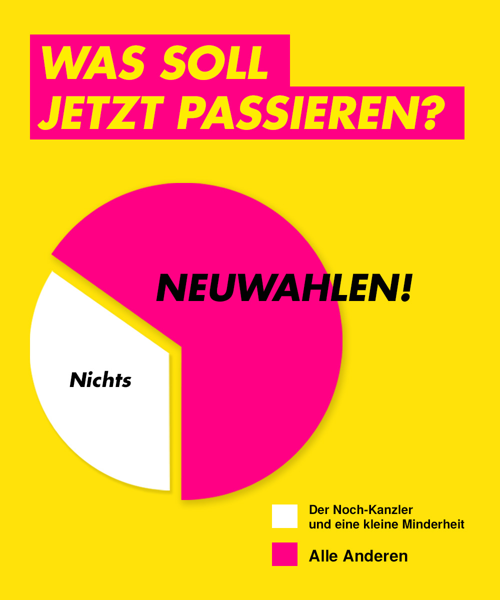 - 65% der Menschen wünschen rasche Neuwahlen und nicht den Zeitplan des Kanzlers (Umfrage von Infratest-Dimap für den ARD-Deutschlandtrend), ebenso zahlreiche Stimmen aus der Wirtschaft.